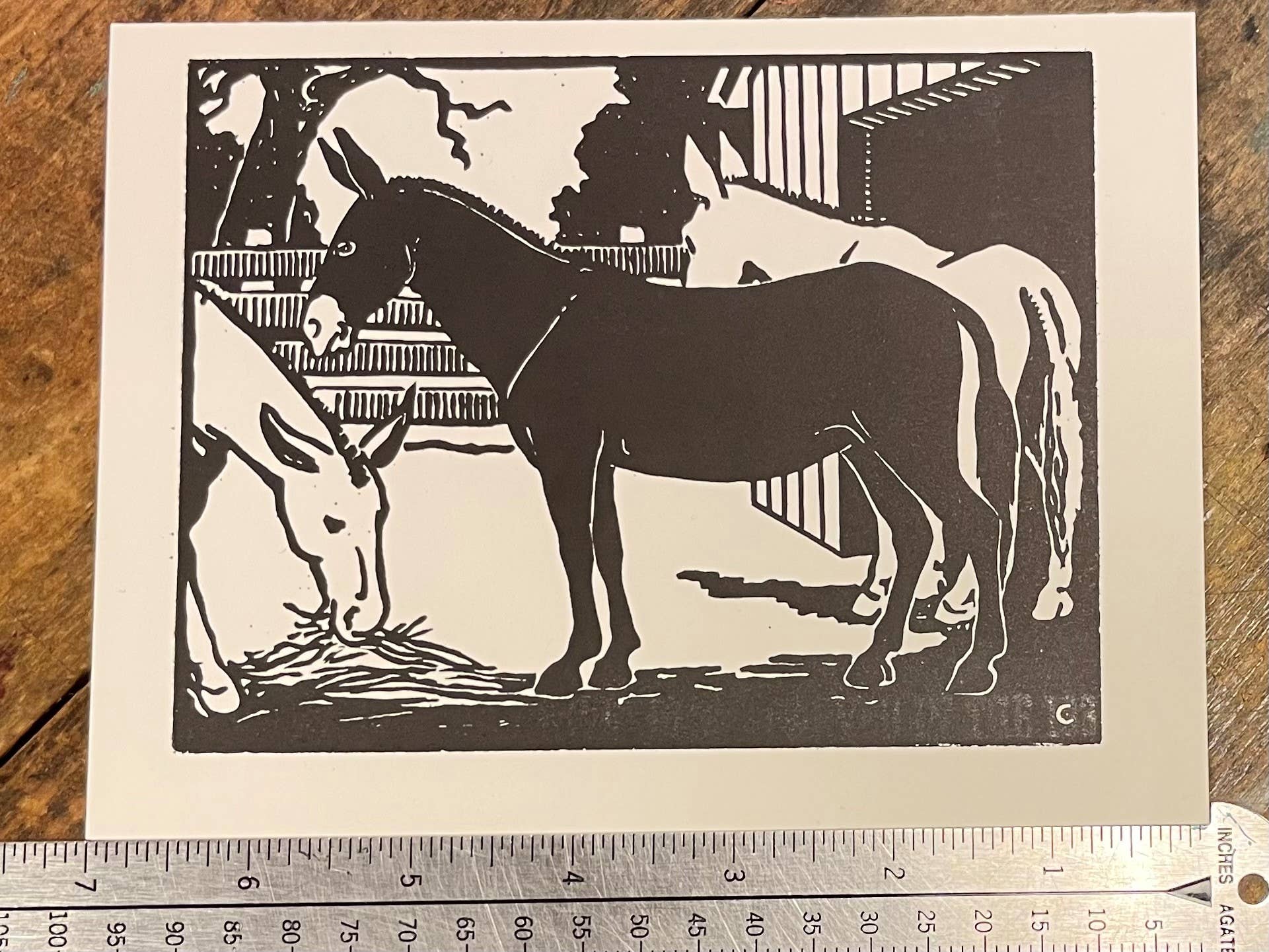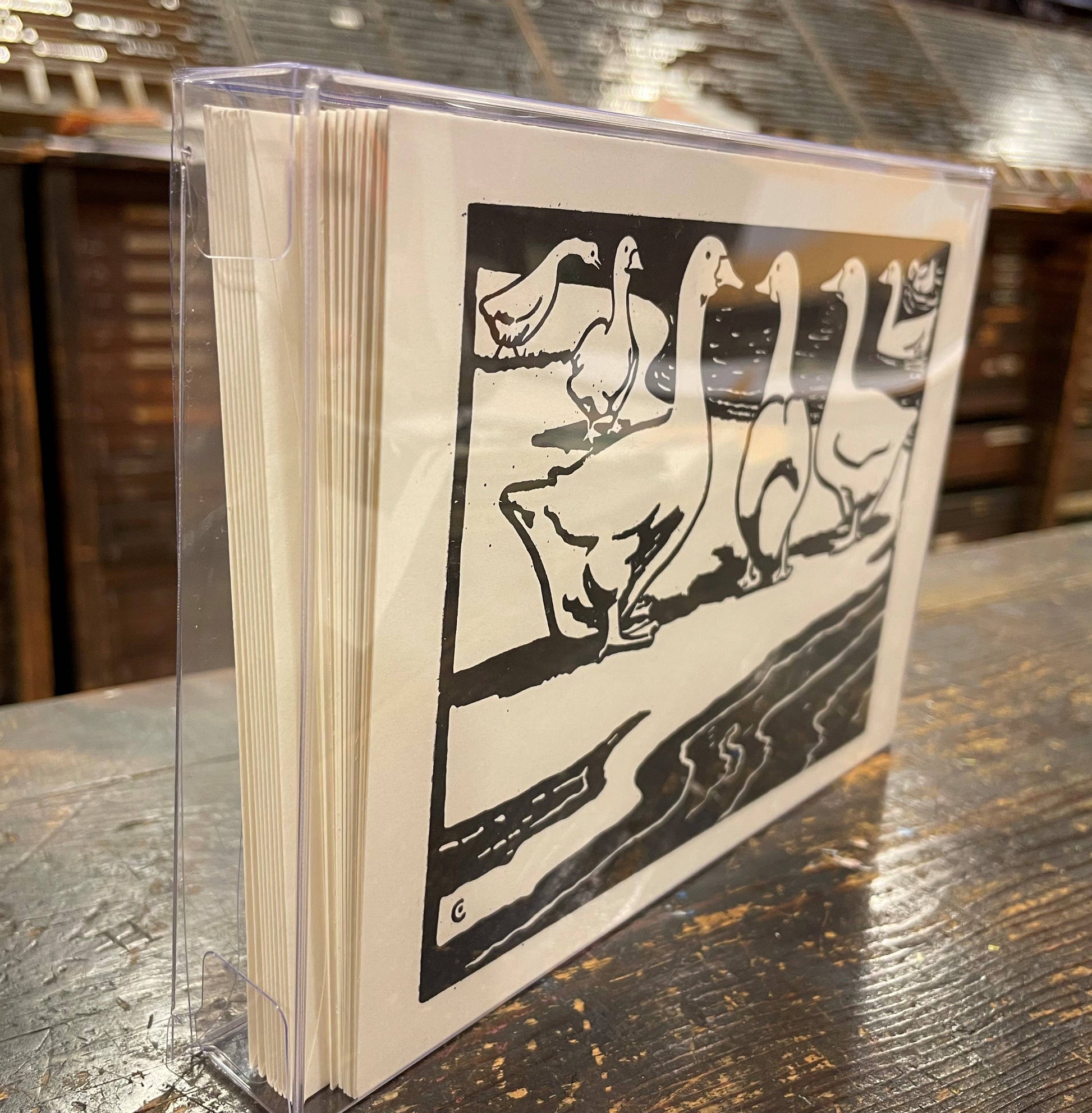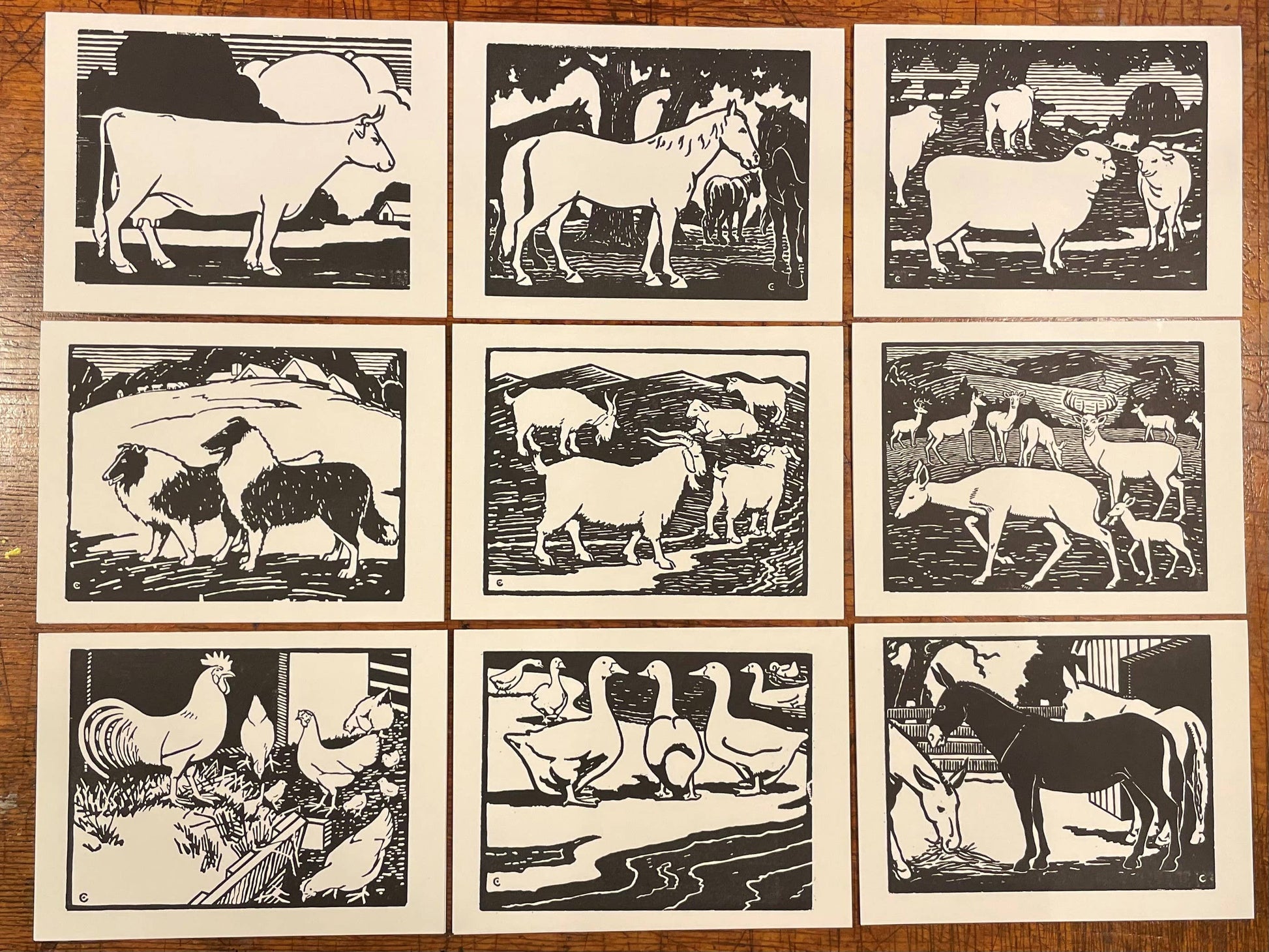 The Barnyard Animals are a series designed in 1933 by Charles Clack of Dallas, Texas. He requested that Hatch Show Print carve the blocks in a unique arrangement that allowed for the many posters pulled from the blocks to be sold to graphic and industrial arts students during the Depression as examples of what can be done in woodcarving. Nashville's Purity Dairy later purchased posters from the same blocks to be given away at grocery stores for children to color with crayons. This set features 9 note cards printed with the original Barnyard Animals, along with 10 envelopes and a set of 4 crayons for coloring.