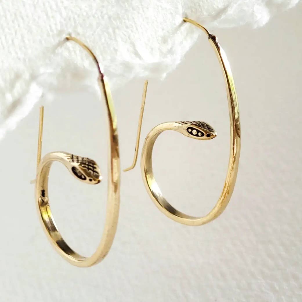 Solid Brass handmade snake hoop earrings.
