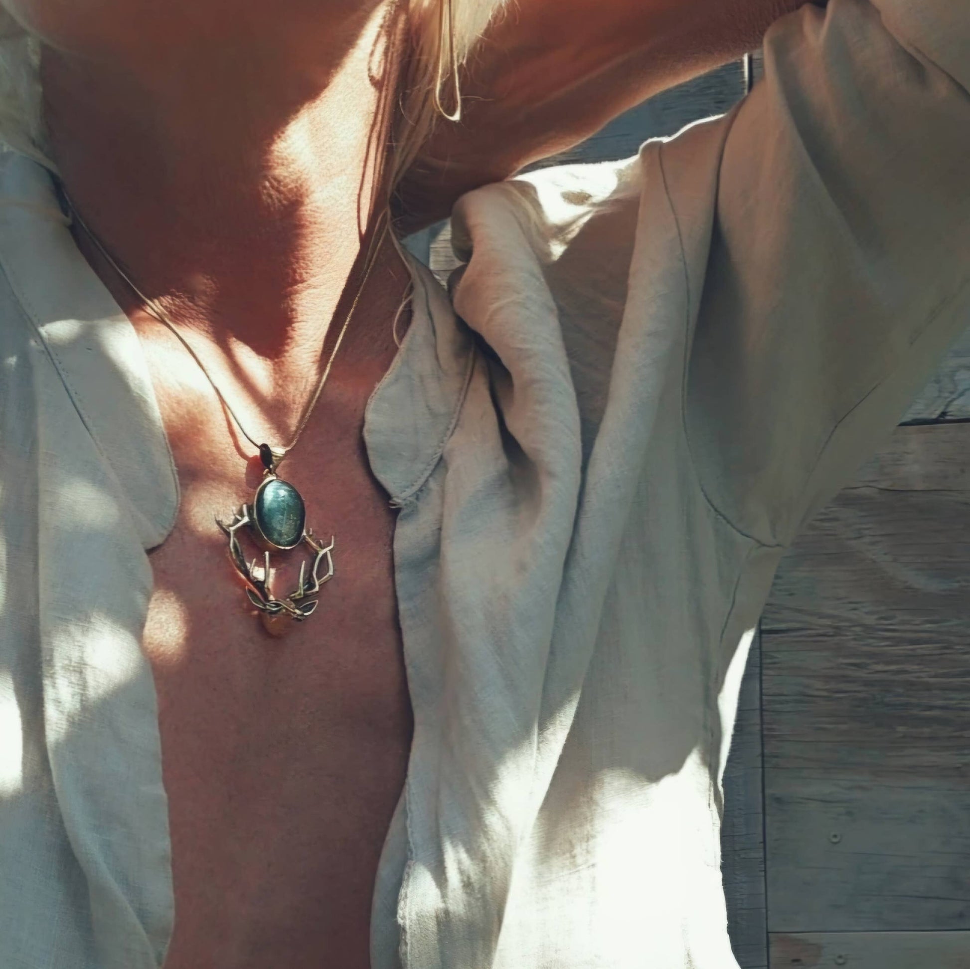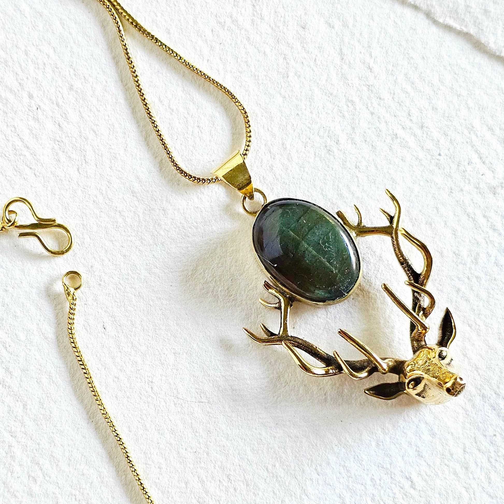 Solid Brass Deer Necklace with Genuine Labradorite Set Stone.