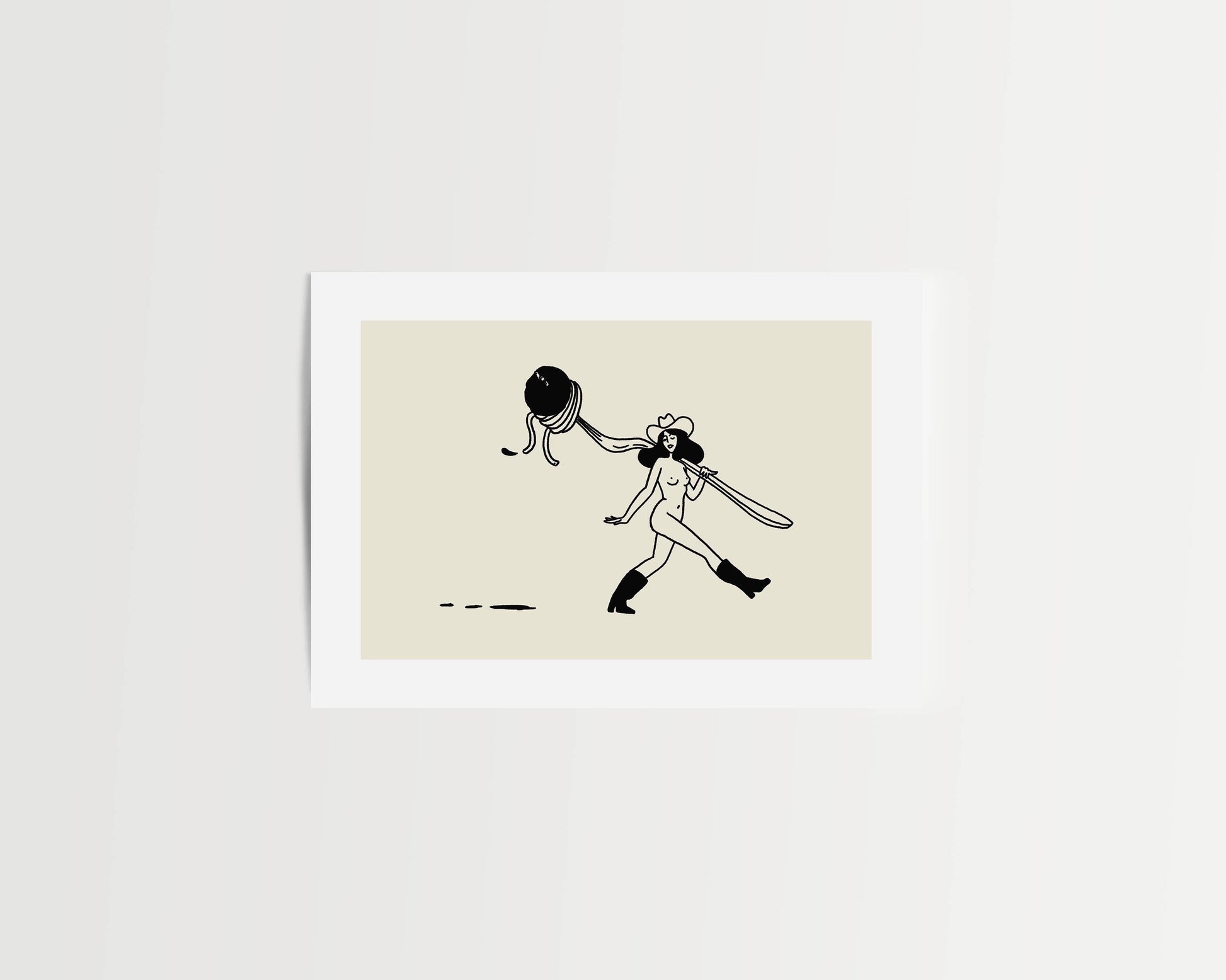 This unframed art print is a humorous and playful take on the classic "spaghetti western" film genre. It features a cowgirl with a giant fork and a twirled meatball in spaghette sauce, making it a perfectly witty and unique piece of wall art. Each art print is individually packaged on high-quality 230 gsm, 12 mil fine art matte paper. It arrives with a rigid backing with logo for authenticity, sealed in a protective, recycled cellophane sleeve.ย