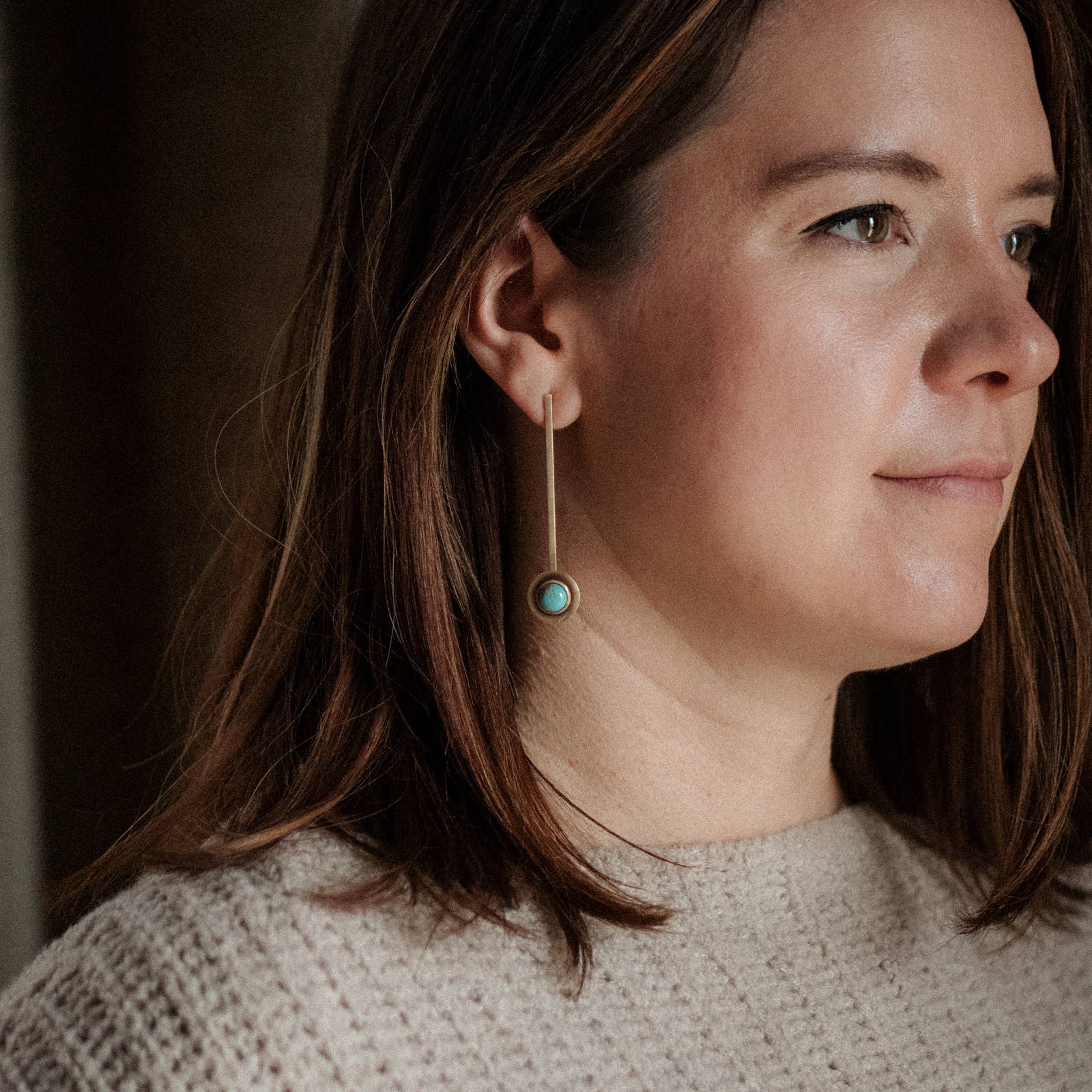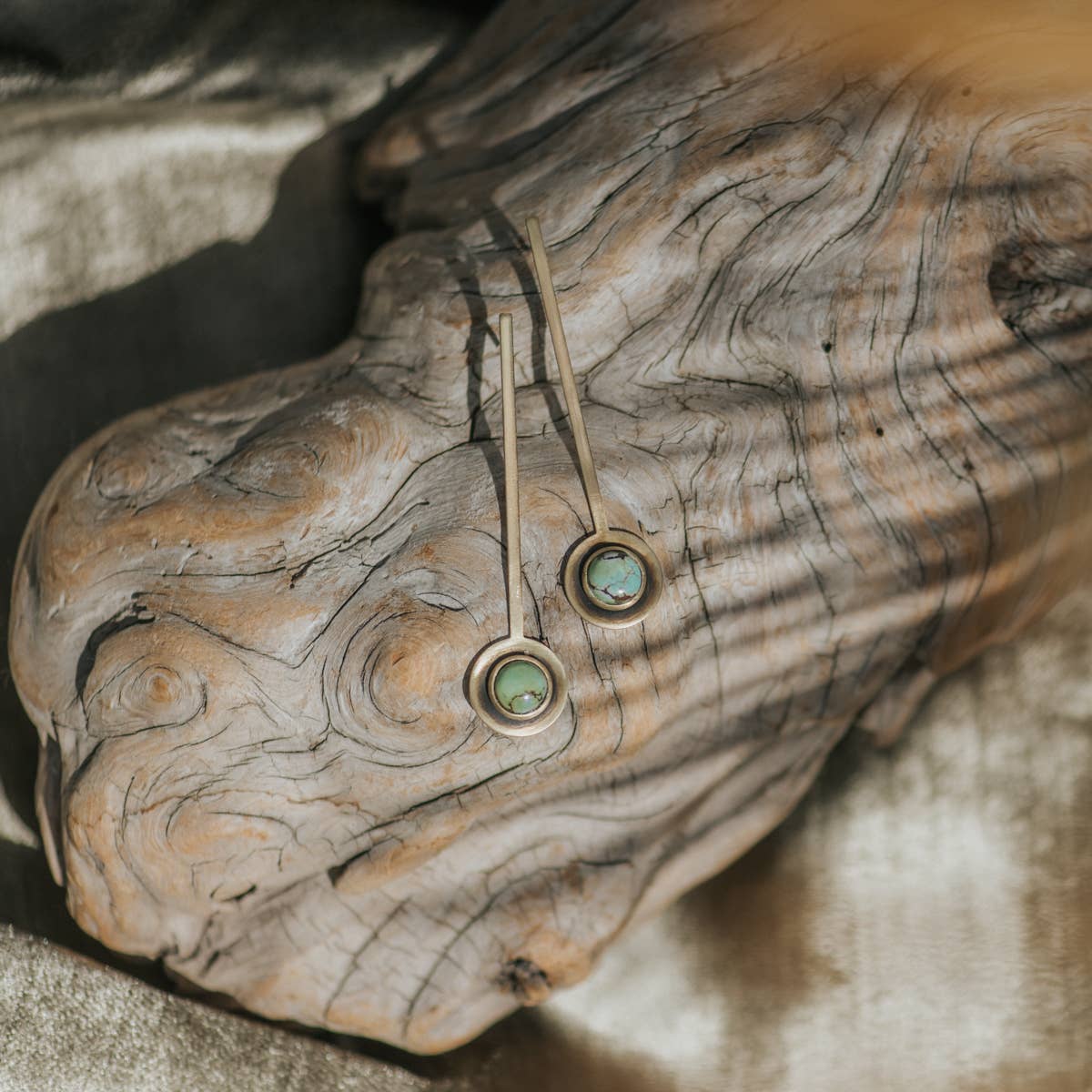 8mm bezel set turquoise pieces sit on 65mm solid brass pieces with an intentional patina.